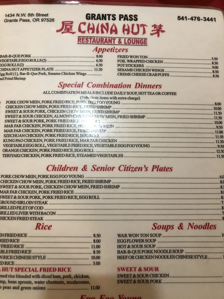 Introducing China Hut, a Chinese restaurant located at 1434 NW 6th St in Grants Pass, OR. This establishment offers a variety of amenities including takeout, delivery, and a full bar. The menu features appetizers like barbecue pork, egg rolls, and sesame chicken wings. Special combination dinners include options like sweet & sour pork and almond chicken chow mein. For children and seniors, there are plates with selections such as ground sirloin steak and chicken liver with bacon. Overall, China Hut provides a diverse range of Chinese dishes in a welcoming environment, perfect for groups and families. The flavors are authentic and the portions are generous, making it a great choice for a delicious meal.